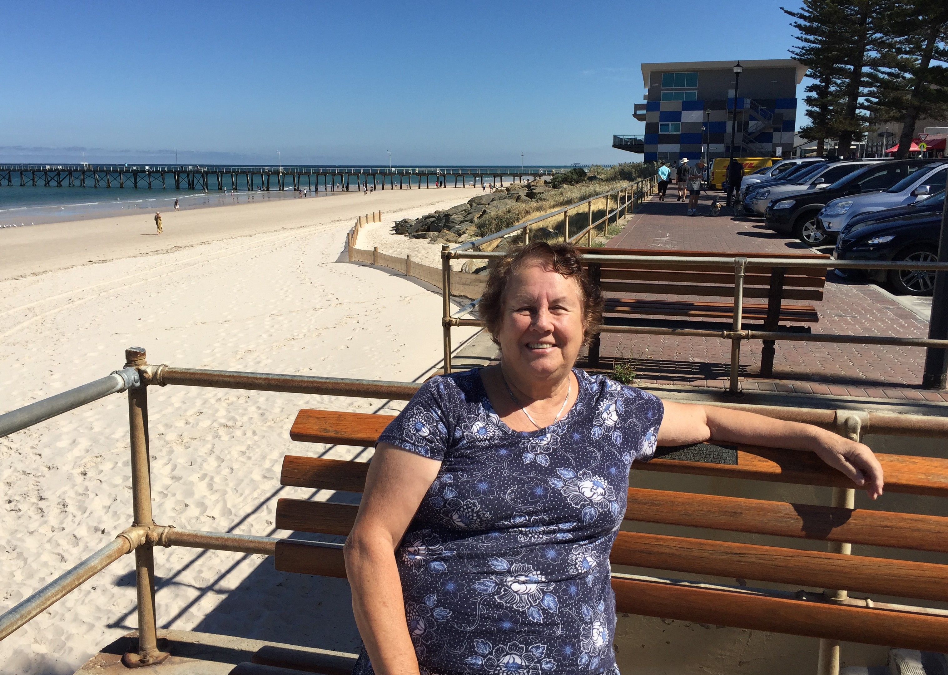- Sitting on a bench on the seafront at Henley Beach.