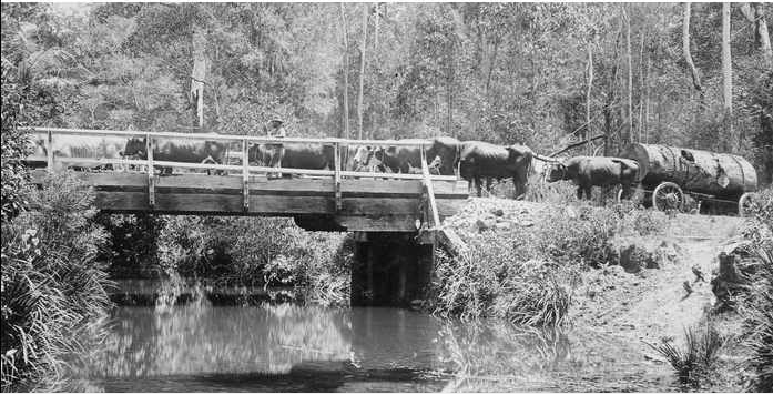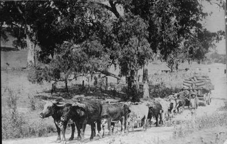 “Bullocks are amazing creatures. Generally a team consists of 8,16 or 24 bullocks and they all have names, they all have personalities. They have a capacity to love you that is almost human. All day I walk up and down beside my team from the ‘leaders’ in the front to the ‘polars’ at the back. I talk to them as if they were my mates. I say ‘Gee off, Patty,’ ‘Come here, Rani,’ You’re bludging, Ginger, pull your weight!’ and I might give Ginger a prod and he’ll jump to attention, jump into life and obey and ram the great bulk of his shoulders behind the bow and lean into it. When he does something wrong I can almost hear him apologize to me, “Sorry Joe, I must have dozed off”‘ When the pull is steady and uniform then my voice is soft and they all dream along happily. They know that if I need quick reaction from them they will hear their name and they will jump at my call. Each of the older bullocks in my team understands my Bullocky ‘lingo.’ Each bullock knows his own name and will respond to whatever instruction I give immediately I give it, immediately his name is called. He knows by the tone of my voice and the volume of the order being delivered whether things are going well or not. The younger bullocks not so long on the team take time to learn their own name and my soothing team lingo during early breaking-in stages.”