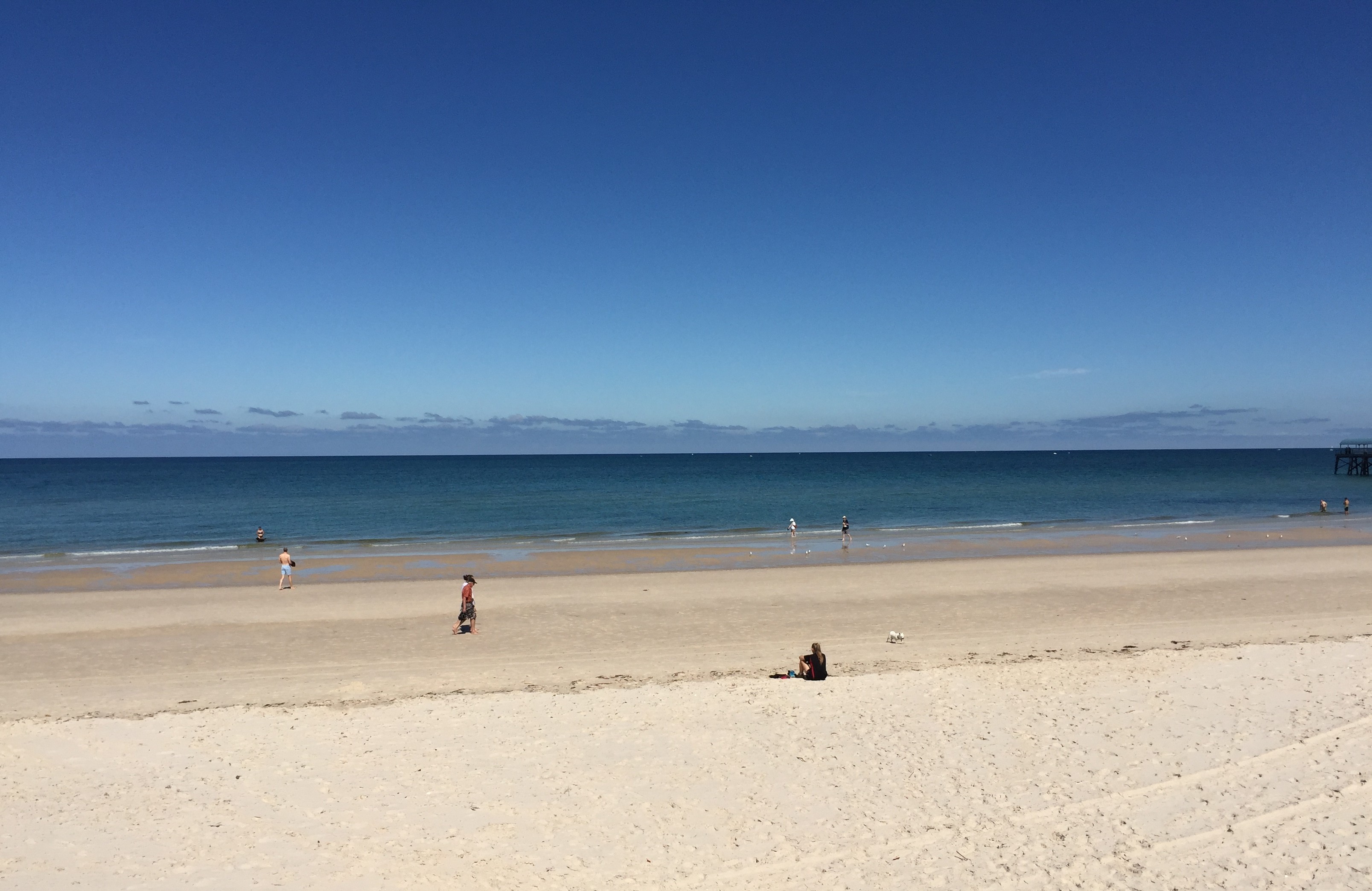 This morning I am sitting on the seafront at Henley Beach at a table in front of Joe’s Cafe. It is a beautiful balmy morning with a light breeze. The sea is flat calm and a pale blue and there are a number of swimmers enjoying the water. I wish I had my bathers with me!